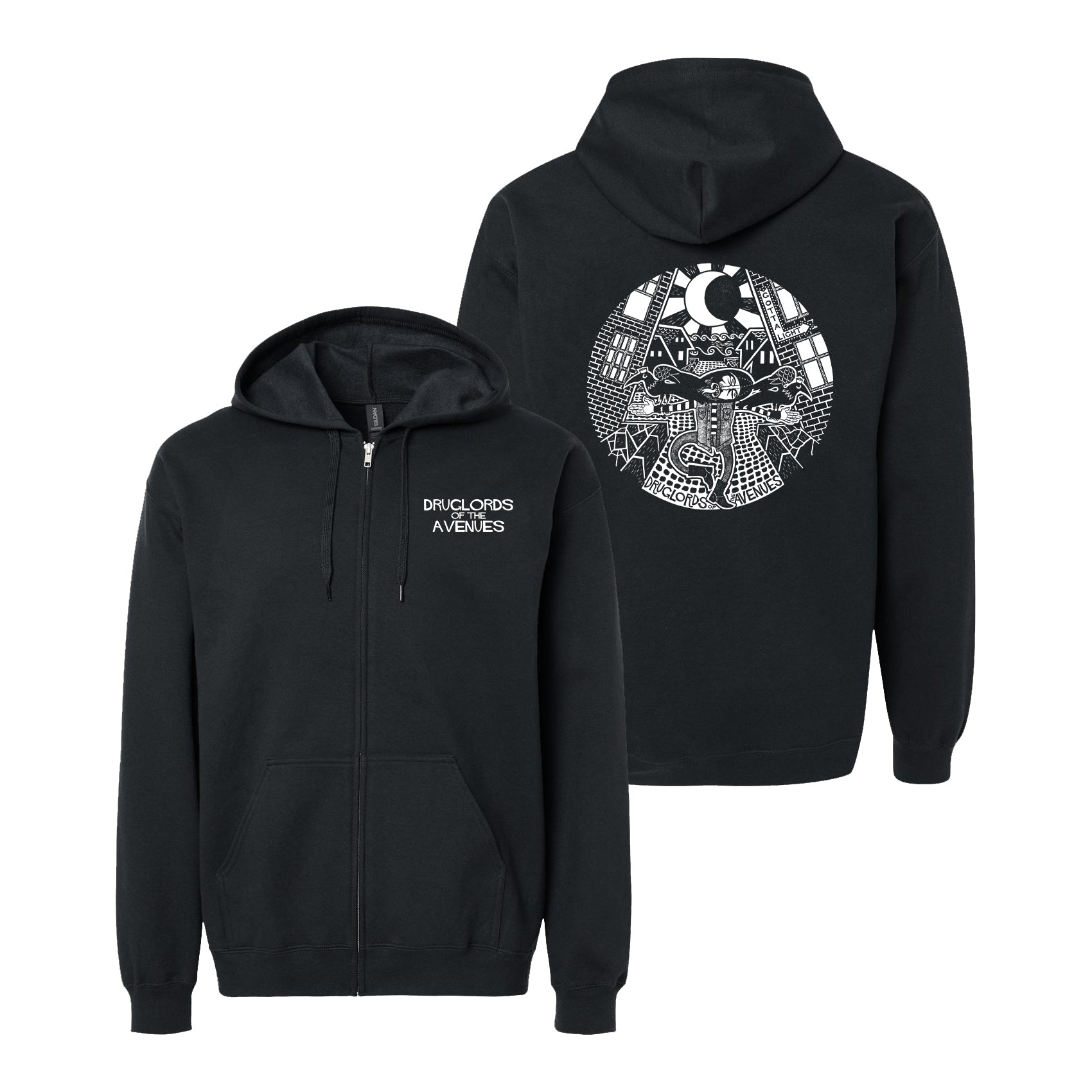 Druglords Of The Avenues - Gotta Light Zip-Up Hoodie - Featuring the Band Logo on the Front Left Chest in White Ink and the Gotta Light Side A Design in White Ink on the Back